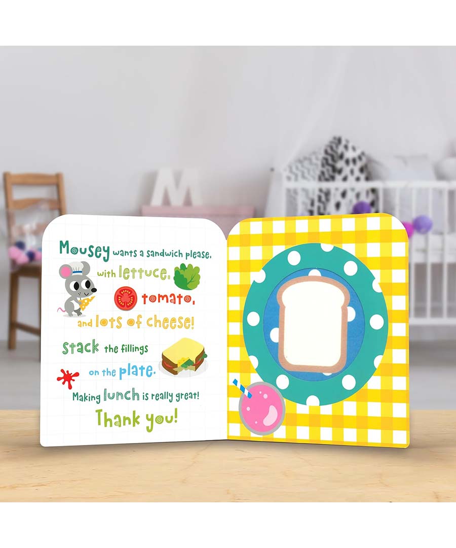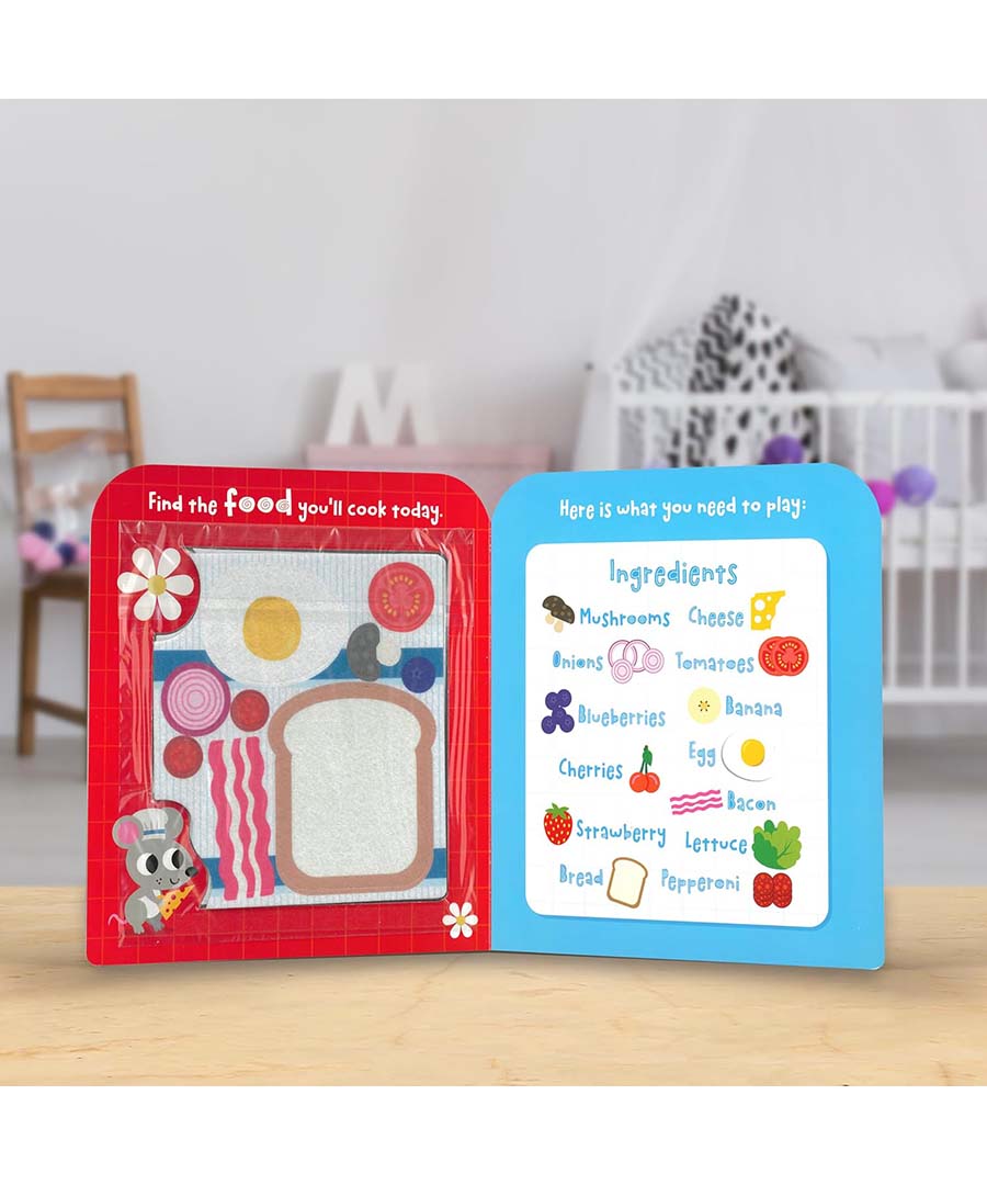 Inspire imaginary play with this fun felt book! My Play Kitchen is an interactive board book with big felt pieces and fuzzy felt pages.Little ones will love taking the felt food out of the fridge-shaped cover, then sticking them to each page to build a sandwich, pizza, and more!