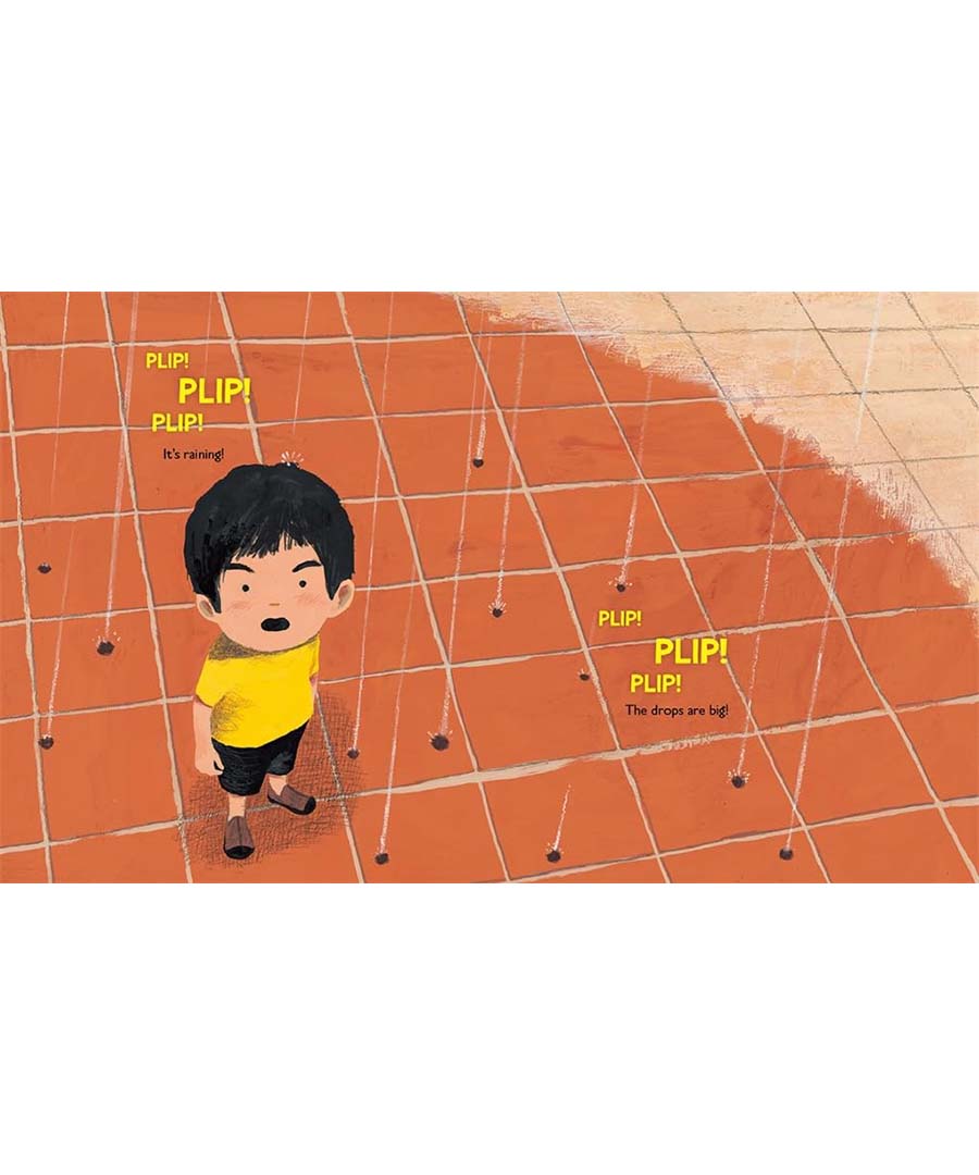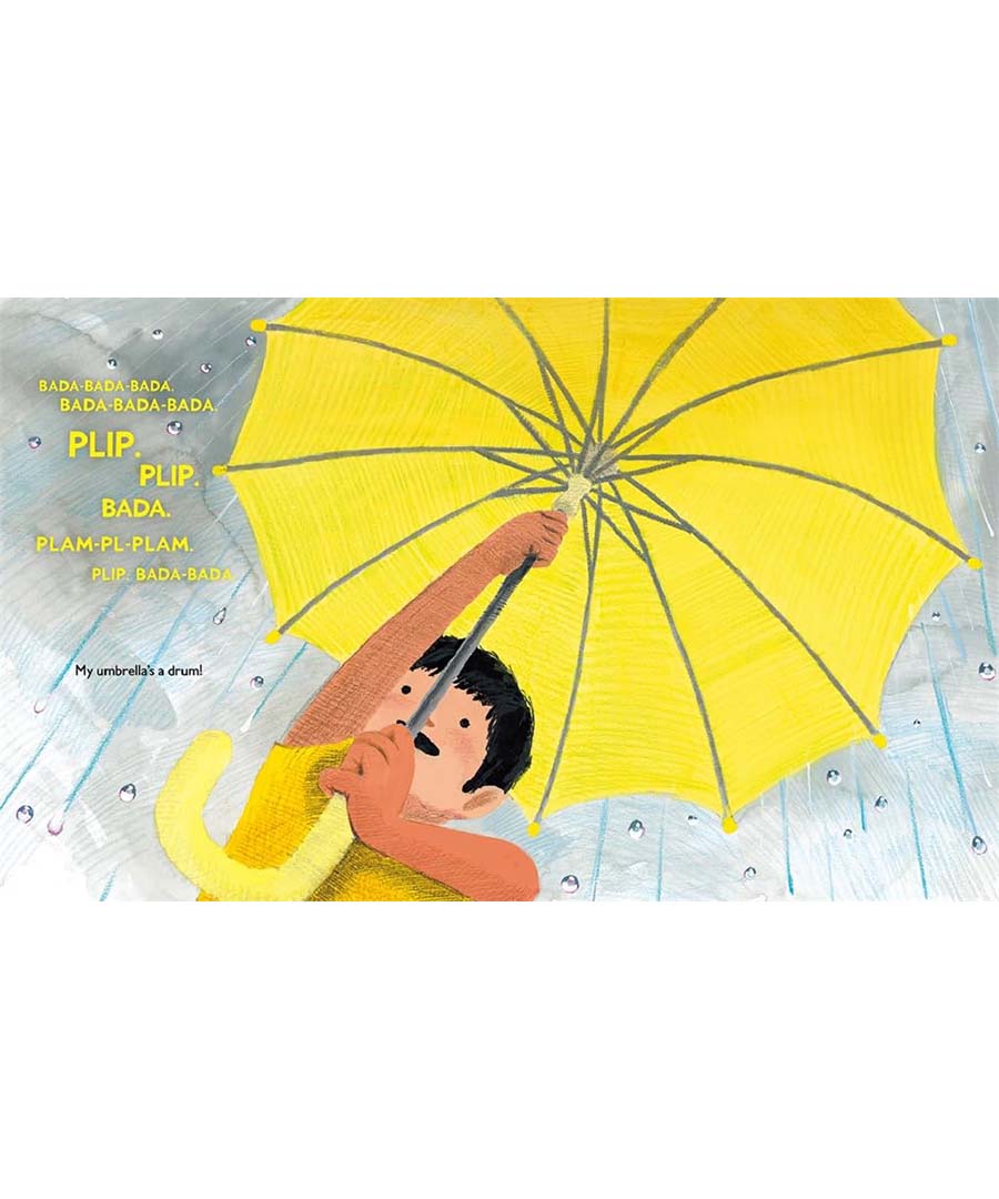 He feels the water droplets on his skin and sees little rivulets of water on the sidewalk. “Badadada”: he hears as the rain hits his yellow umbrella, “Ker-sploosh” as he jumps in a puddle.