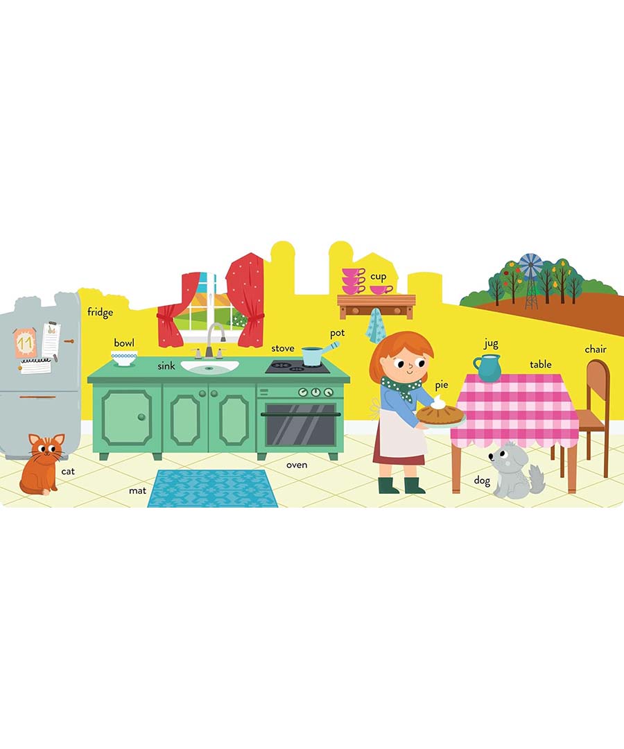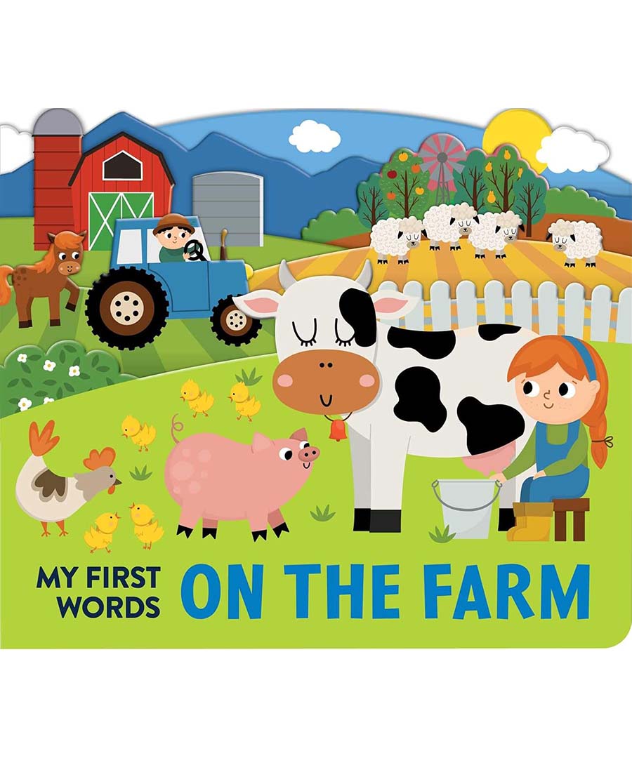 Designed for children ages 0-3, this engaging shaped board book introduces first words through charming farm and home scenes. Each page is filled with brightly colored illustrations, simple word labels, and fun cut-out shapes along the top, creating a hands-on learning experience. From fluffy chicks to tractors in the field, toddlers will love pointing, naming, and discovering new words as they explore the farm. With sturdy pages perfect for small hands, this book is an ideal introduction to language and early vocabulary.