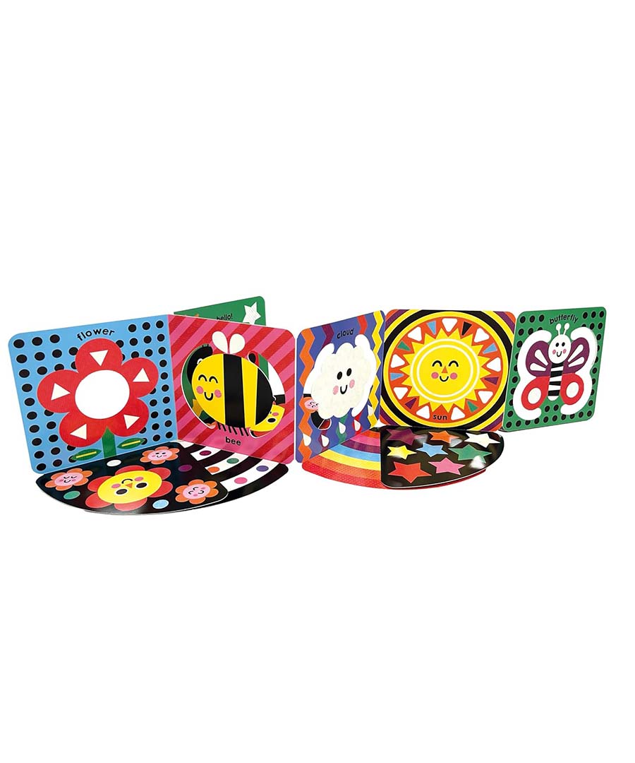 - The sturdy design folds out and stands upright, allowing babies to interact with the book as they lie on their front
