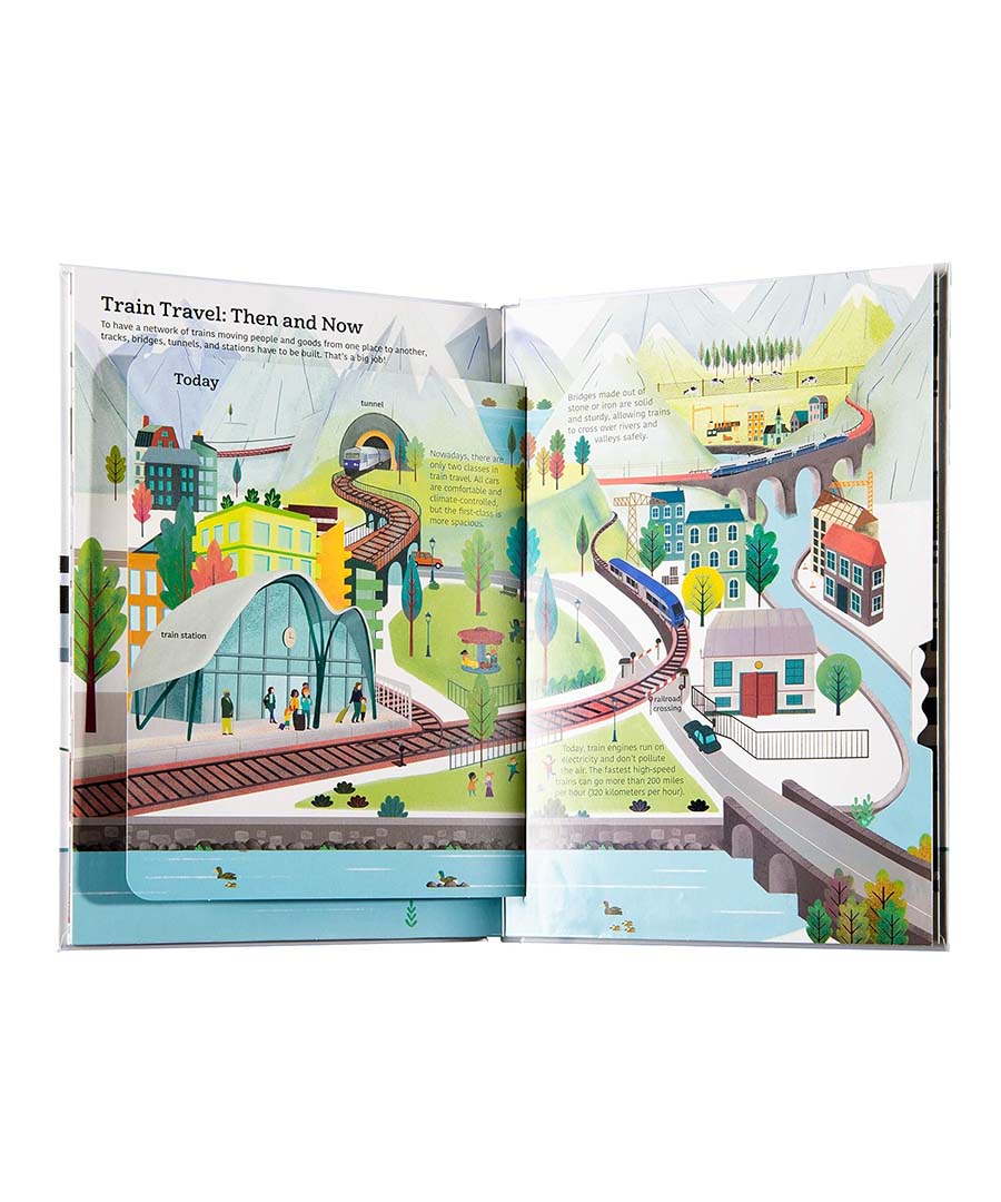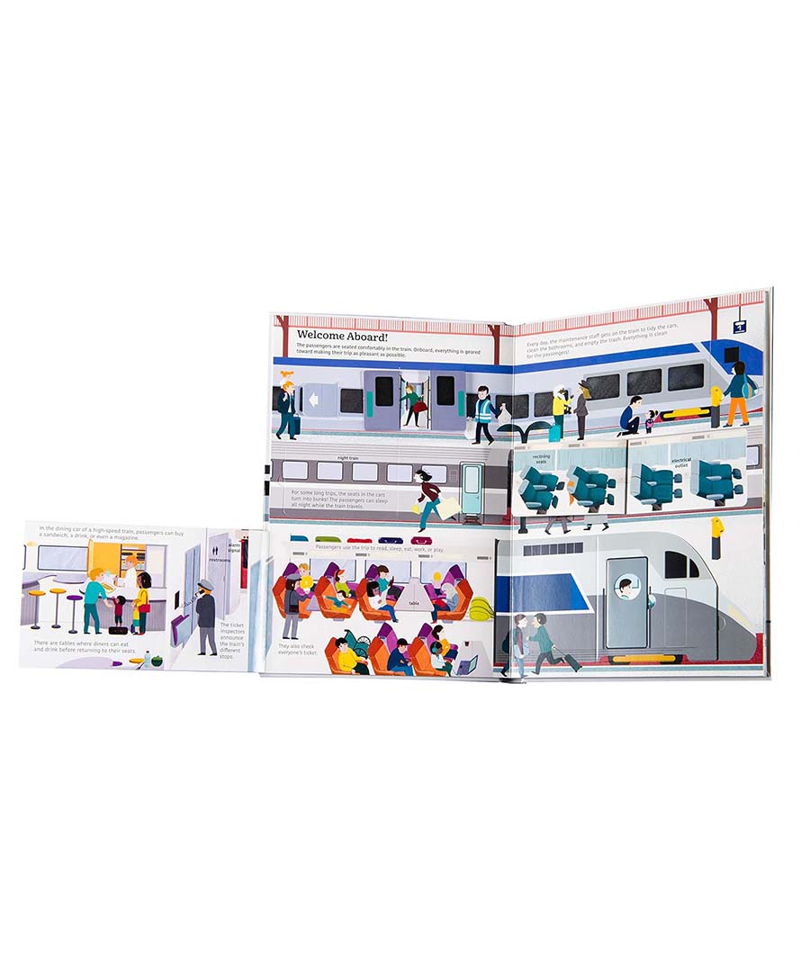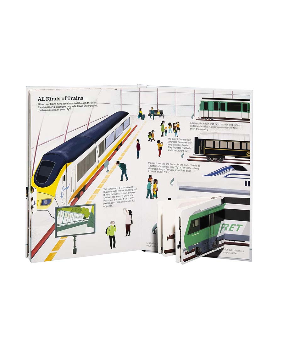 Discover the wonderful world of trains: Pull a tab to open train doors, life flaps to see inside a train car, or turn a wheel to see different types of trains. Chock-full of age appropriate information, this book is an exciting introduction for young train and transportation enthusiasts.