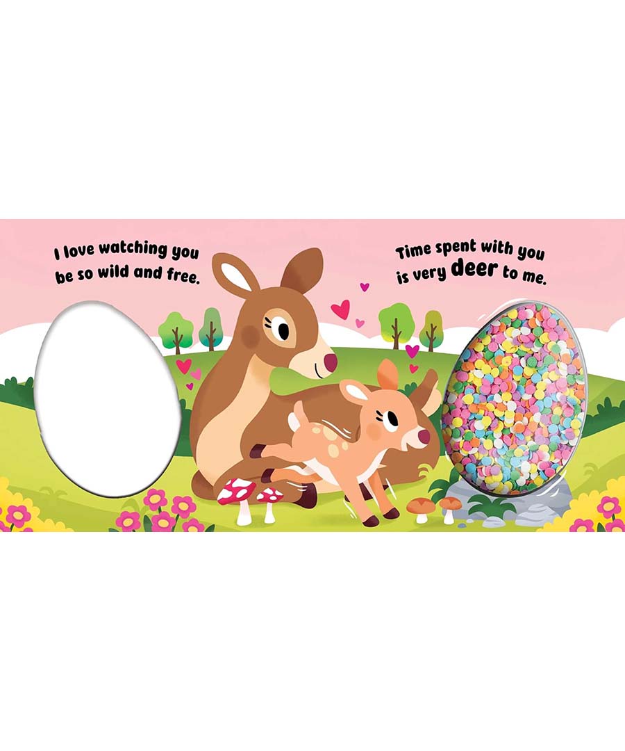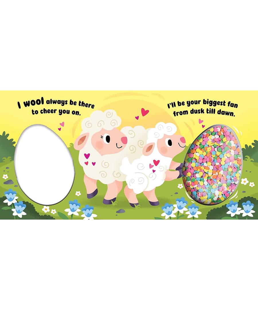 Shake up the season with this adorable Easter board book full of cute animal puns and a plastic egg filled with colorful sequins!