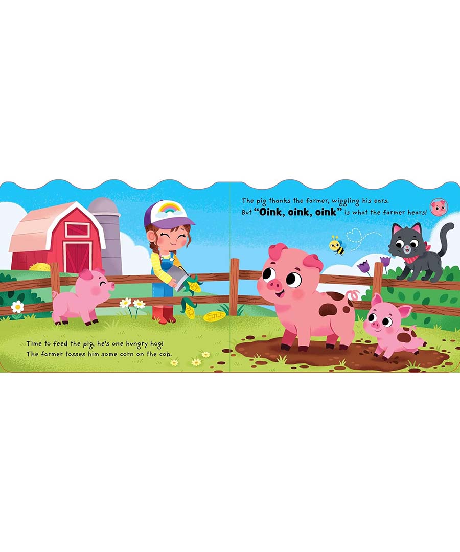 It’s feeding time on the farm, and the animals can barely contain their excitement! Little ones will love reading this rhyming story as the cow, pig, sheep, duck, rooster, and horse are fed around the farm in this illustrated board book with a handle and 6 interactive sound buttons to press throughout. With real animal noises and a jaunty farm tune for each animal, this on the go sound book is a kind of a pig deal!