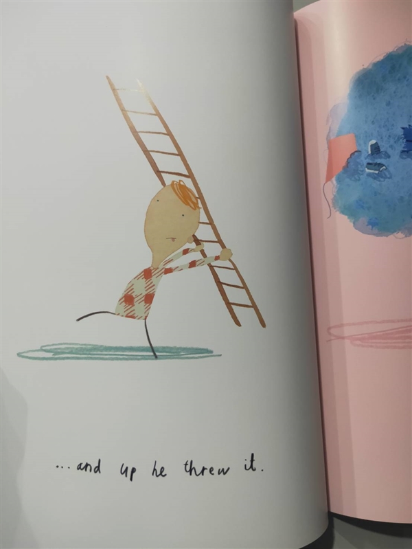 為了救回鞋子,他又丟了另一隻鞋子….結果…風箏和鞋子還是一動也不動的掛在樹上。小男孩就這樣不斷的把東西往樹上丟......貓咪、椅子、腳踏車、甚至房子、大鯨魚、消防車和輪船全卡在樹上。隨著不斷堆疊的情節,大樹在每頁中以不同的顏色呈現,就如同男孩的情緒,不斷地起伏變化著。就在最後,當小男孩耗盡力氣時,風箏卻靜靜輕輕的飄落地面。